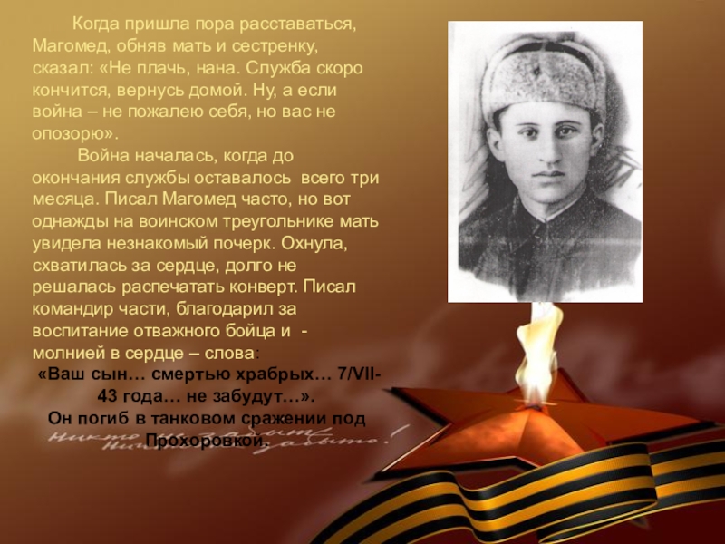 Война началась, когда до окончания службы оставалось всего три месяца. Писал Магомед часто, но вот однажды на воинском треугольнике мать увидела незнакомый почерк. Охнула, схватилась за сердце, долго не решалась распечатать конверт. Писал командир части, благодарил за воспитание отважного бойца и - молнией в сердце – слова:
