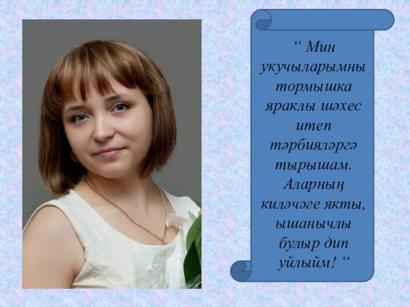 “ Мин укучыларымны тормышка яраклы шәхес итеп тәрбияләргә тырышам. Аларның киләчәге якты, ышанычлы булыр дип уйлыйм! “
