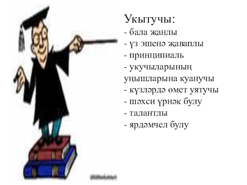Слайд 8Укытучы: - бала җанлы - үз эшенә җаваплы - принципиаль - укучыларының уңышларына куанучы - күзләрдә