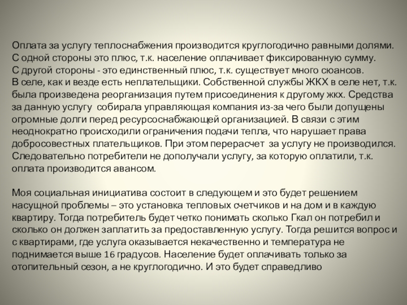 В селе, как и везде есть неплательщики. Собственной службы ЖКХ в селе нет, т.к. была произведена реорганизация путем присоединения к другому жкх. Средства за данную услугу собирала управляющая компания из-за чего были допущены огромные долги перед ресурсоснабжающей организацией. В связи с этим неоднократно происходили ограничения подачи тепла, что нарушает права добросовестных плательщиков. При этом перерасчет за услугу не производился. Следовательно потребители не дополучали услугу, за которую оплатили, т.к. оплата производится авансом.