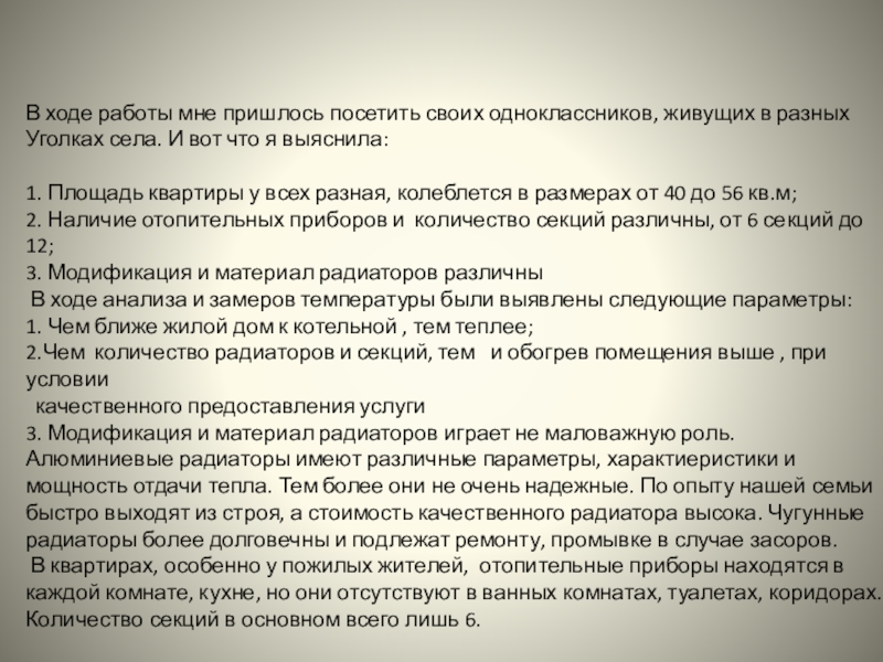 В квартирах, особенно у пожилых жителей, отопительные приборы находятся в каждой комнате, кухне, но они отсутствуют в ванных комнатах, туалетах, коридорах. Количество секций в основном всего лишь 6.