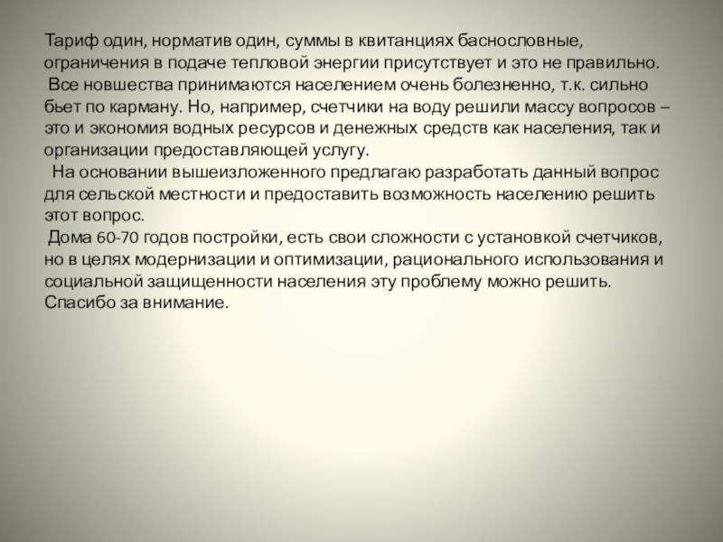 Слайд 8Тариф один, норматив один, суммы в квитанциях баснословные, ограничения в подаче