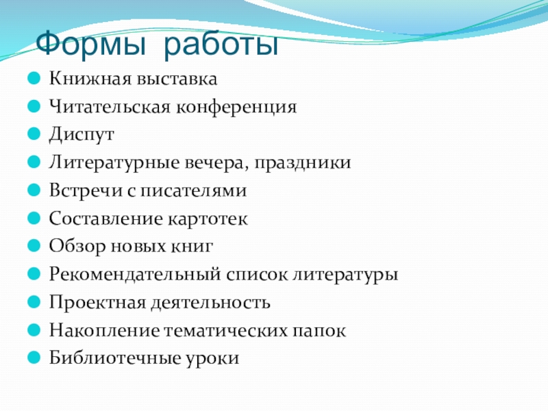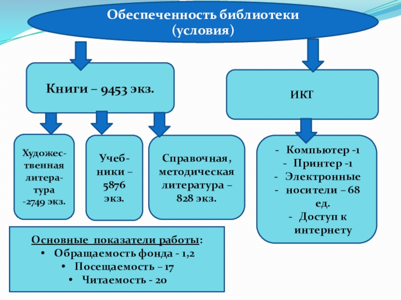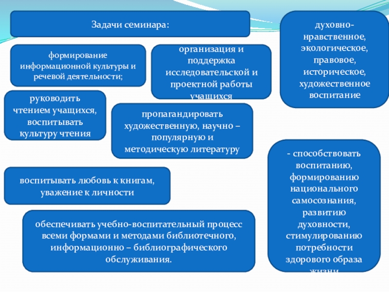 обеспечивать учебно-воспитательный процесс всеми формами и методами библиотечного, информационно – библиографического обслуживания.