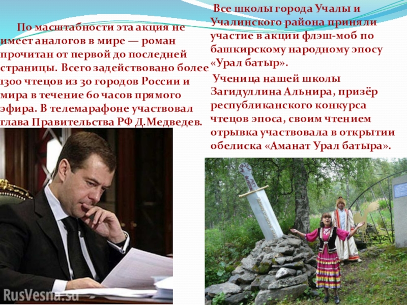Ученица нашей школы Загидуллина Альнира, призёр республиканского конкурса чтецов эпоса, своим чтением отрывка участвовала в открытии обелиска «Аманат Урал батыра».