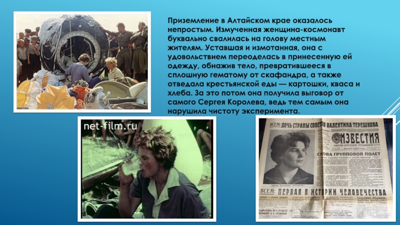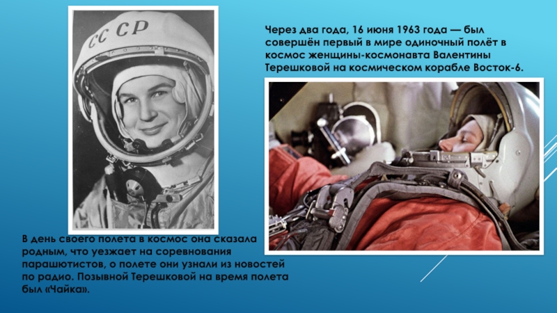 В день своего полета в космос она сказала родным, что уезжает на соревнования парашютистов, о полете они узнали из новостей по радио. Позывной Терешковой на время полета был «Чайка».
