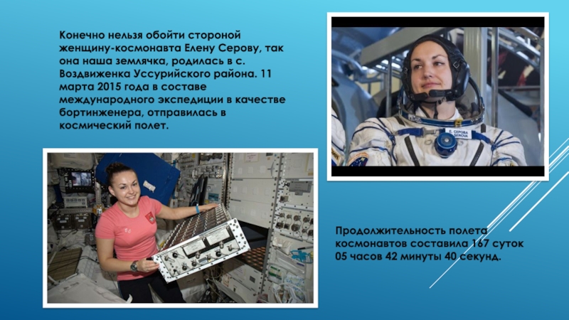 Продолжительность полета космонавтов составила 167 суток 05 часов 42 минуты 40 секунд.