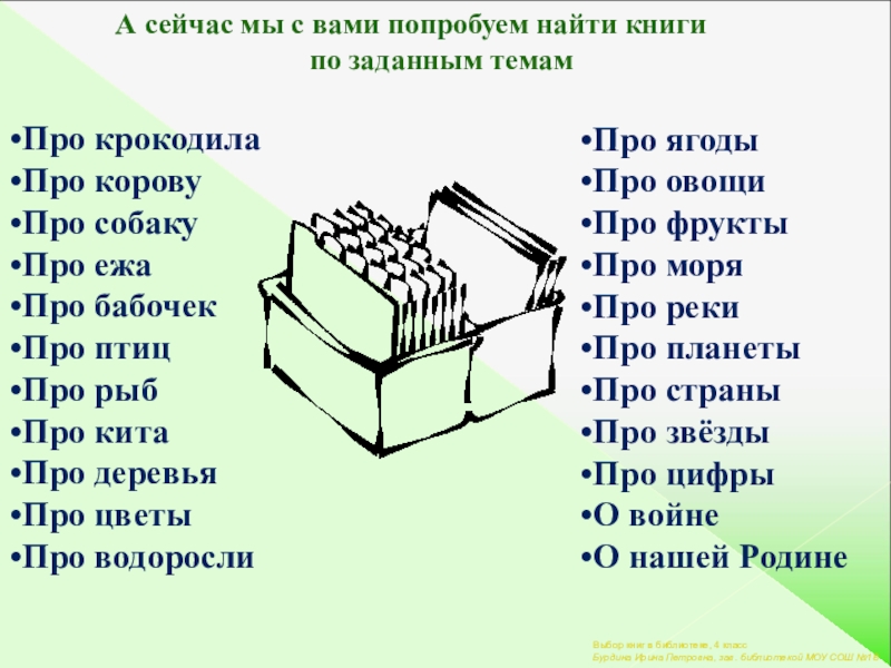 Вы спросите: «А зачем нужен такой сложный каталог?» А необходим он для того, чтобы вы могли при подготовке к урокам без труда найти нужную книгу, и при этом не нужно долго рыться на пыльных полках, не зная, есть вообще в библиотеке эта книга, или её вообще нет.