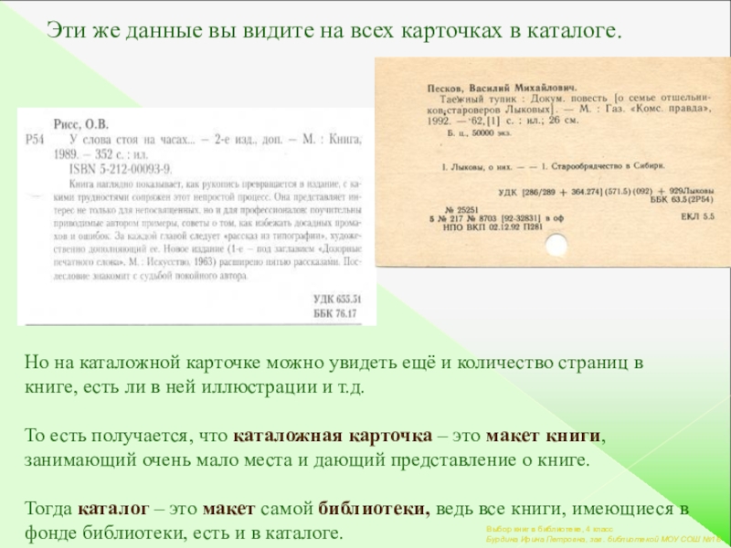 И точно так же, как и на полках книги, каталожные карточки разделены на разделы по отраслям знания. При этом названия разделов систематического каталога в точности соответствуют названиям разделов на книжных полках.