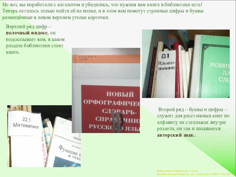 Второй ряд – буквы и цифры – служит для расстановки книг по алфавиту на стеллажах внутри раздела, он так и называется авторский знак.
