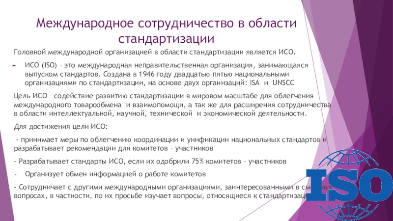 ИСО (ISO) – это международная неправительственная организация, занимающаяся выпуском стандартов. Создана в 1946 году двадцатью пятью национальными организациями по стандартизации, на основе двух организаций: ISA и UNSCC