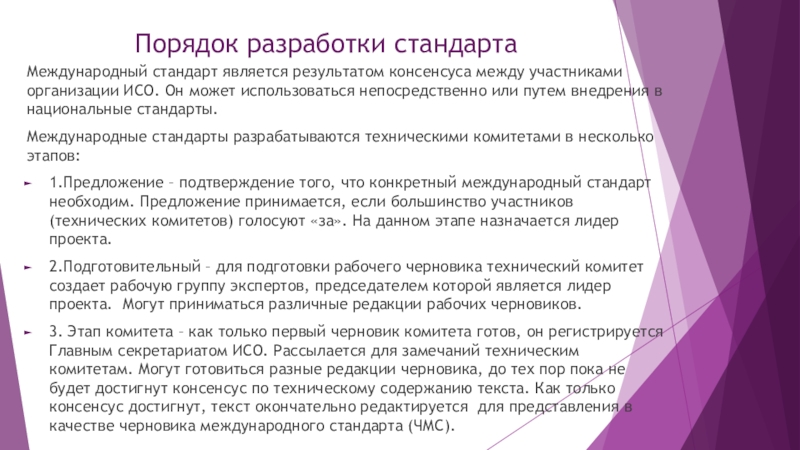 3. Этап комитета – как только первый черновик комитета готов, он регистрируется Главным секретариатом ИСО. Рассылается для замечаний техническим комитетам. Могут готовиться разные редакции черновика, до тех пор пока не будет достигнут консенсус по техническому содержанию текста. Как только консенсус достигнут, текст окончательно редактируется для представления в качестве черновика международного стандарта (ЧМС).