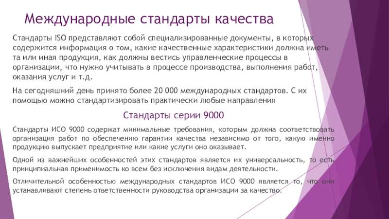 Одной из важнейших особенностей этих стандартов является их универсальность, то есть принципиальная применимость ко всем без исключения видам деятельности.