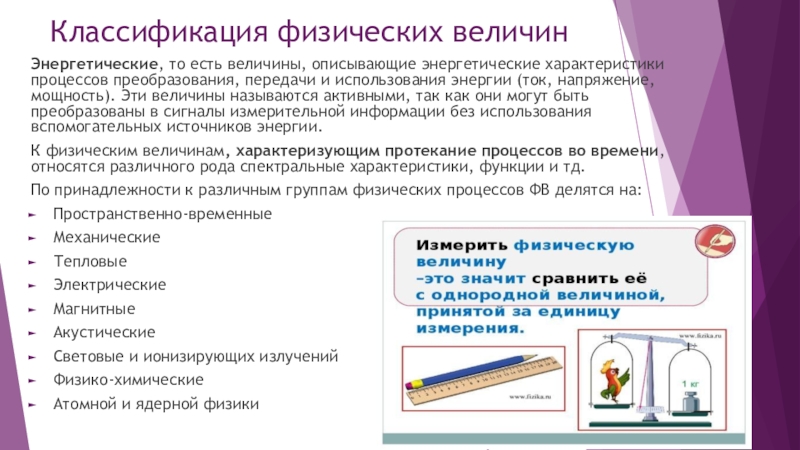 По видам явлений физические величины делятся: вещественные, энергетические и