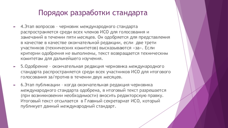 6.Этап публикации – когда окончательная редакция черновика международного стандарта одобрена, в итоговый текст разрешается (при возникновении необходимости) вносить редакторскую правку. Итоговый текст отсылается в Главный секретариат ИСО, который публикует данный международный стандарт.