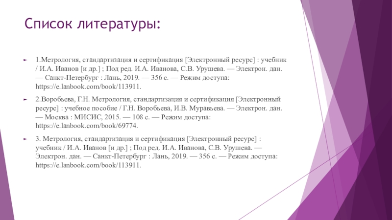 3. Метрология, стандартизация и сертификация [Электронный ресурс] : учебник / И.А. Иванов [и др.] ; Под ред. И.А. Иванова, С.В. Урушева. — Электрон. дан. — Санкт-Петербург : Лань, 2019. — 356 с. — Режим доступа: https://e.lanbook.com/book/113911.