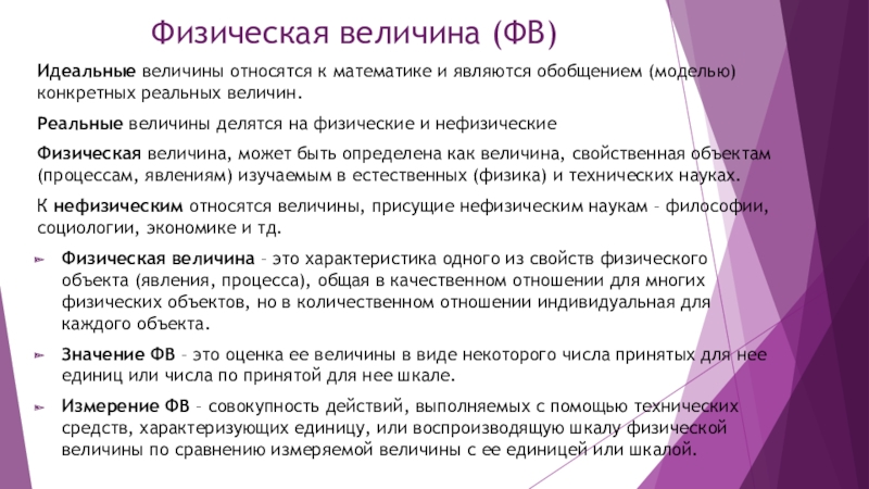 Физическая величина, может быть определена как величина, свойственная объектам (процессам, явлениям) изучаемым в естественных (физика) и технических науках.