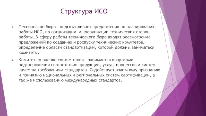 организации и координации технических сторон работы. В сферу работы технического бюро входят рассмотрение предложений по созданию и роспуску технических комитетов, определение области стандартизации, которой должны заниматься комитеты.
