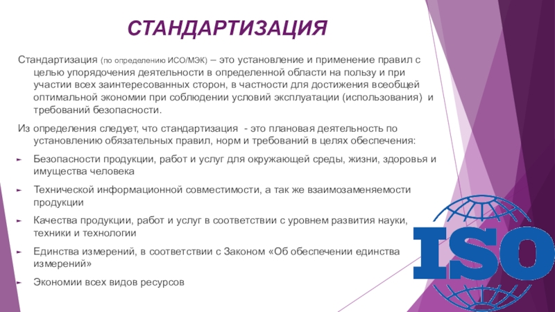 Цель ИСО – содействие развитию стандартизации в мировом масштабе для облегчения международного товарообмена и взаимопомощи, а так же для расширения сотрудничества в области интеллектуальной, научной, технической и экономической деятельности.