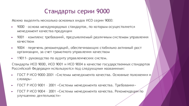 Стандарты ИСО 9000, ИСО 9001 и ИСО 9004 в качестве государственных стандартов Российской Федерации используются под следующими названиями: