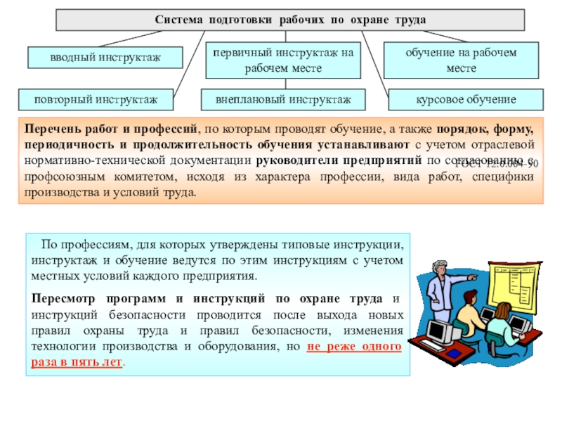 Перечень работ и профессий, по которым проводят обучение, а также порядок, форму, периодичность и продолжительность обучения устанавливают с учетом отраслевой нормативно-технической документации руководители предприятий по согласованию с профсоюзным комитетом, исходя из характера профессии, вида работ, специфики производства и условий труда.