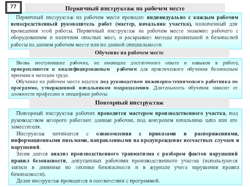 Повторный инструктаж рабочих проводится мастером производственного участка, под руководством которого работают данные рабочие, под контролем начальника цеха или его заместителя.