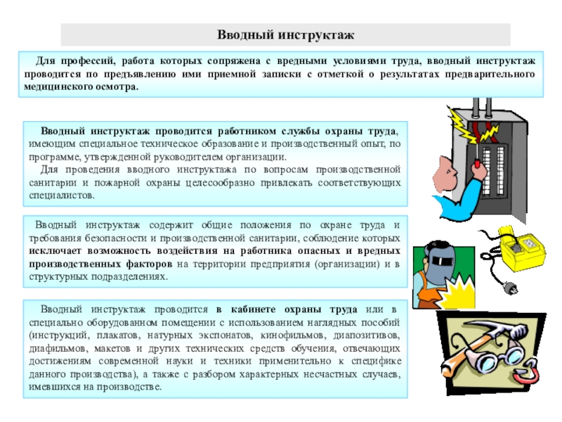 Вводный инструктаж проводится в кабинете охраны труда или в специально оборудованном помещении с использованием наглядных пособий (инструкций, плакатов, натурных экспонатов, кинофильмов, диапозитивов, диафильмов, макетов и других технических средств обучения, отвечающих достижениям современной науки и техники применительно к специфике данного производства), а также с разбором характерных несчастных случаев, имевшихся на производстве.