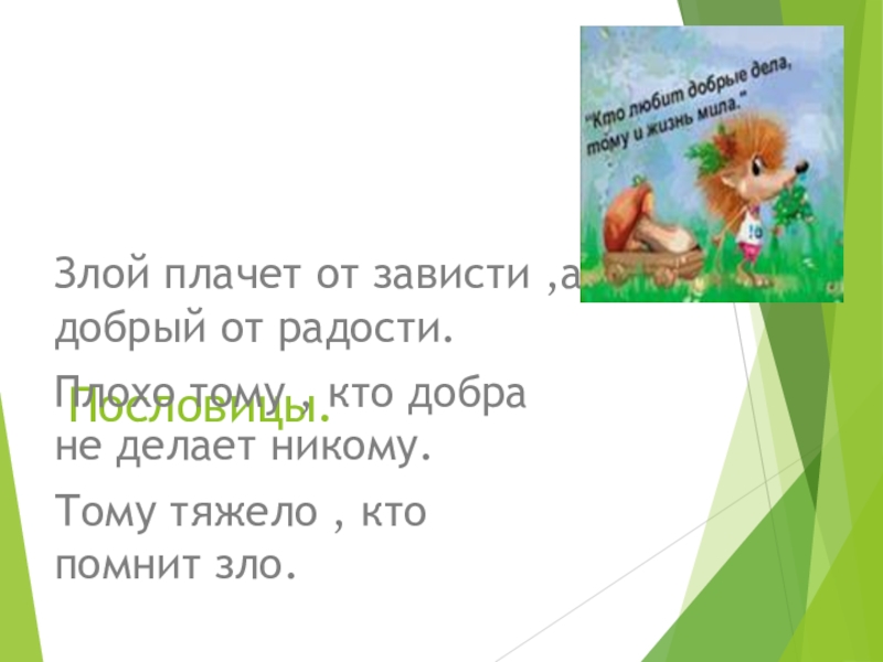 Пословицы.Злой плачет от зависти ,а добрый от радости.Плохо тому , кто добра не делает никому.Тому тяжело ,