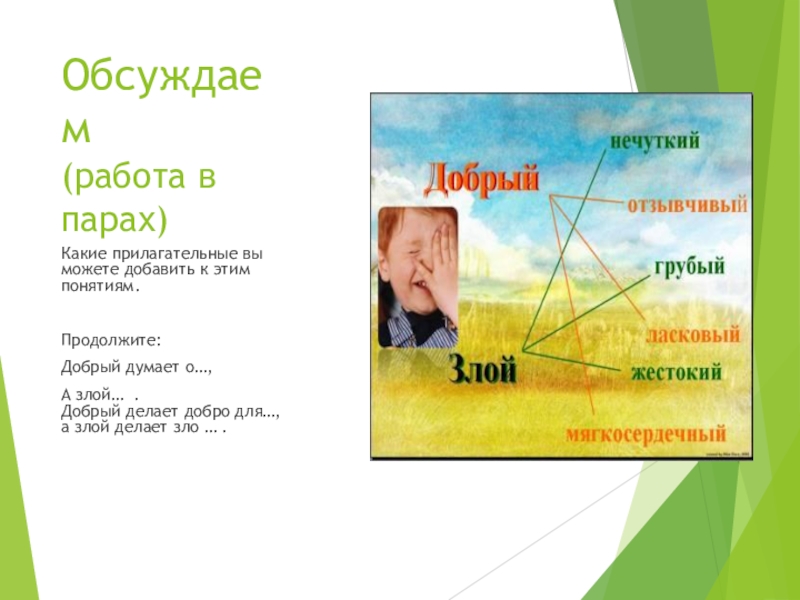 Обсуждаем (работа в парах)Какие прилагательные вы можете добавить к этим понятиям.Продолжите:Добрый думает о…,А злой… . Добрый