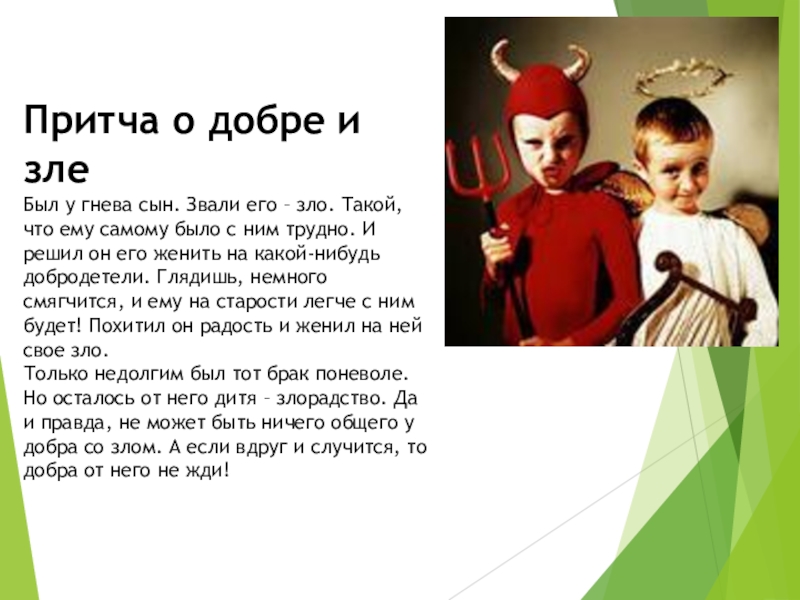 Притча о добре и злеБыл у гнева сын. Звали его – зло. Такой, что ему самому было