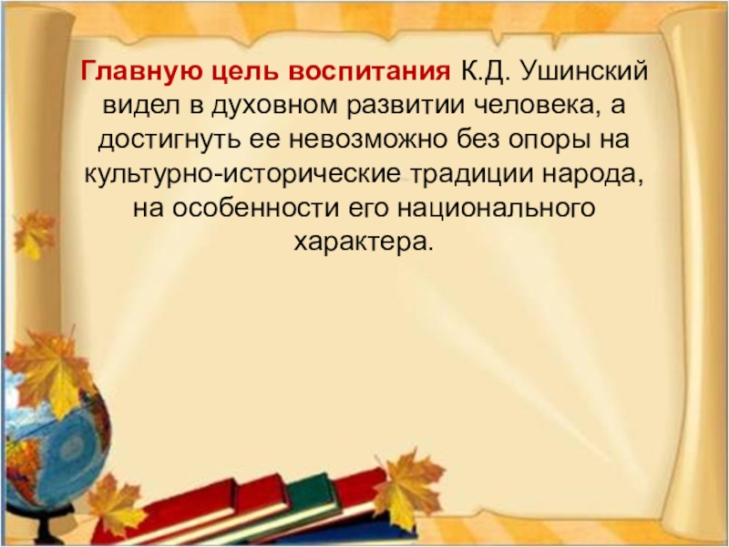 Слайд 9Главную цель воспитания К.Д. Ушинский видел в духовном развитии человека, а