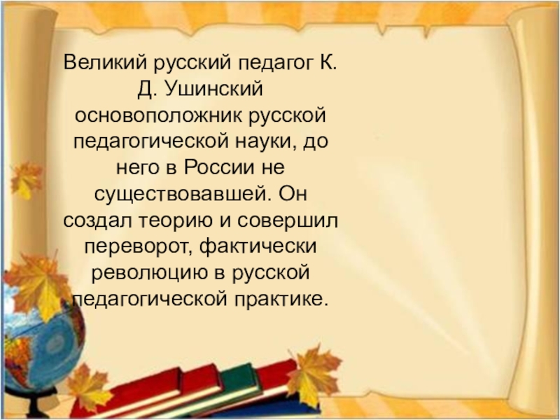 Слайд 3Великий русский педагог К. Д. Ушинский основоположник русской педагогической науки, до
