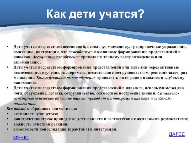 что способствует поэтапному формированию представлений и навыков. Ассоциативное обучение приводит к точному воспроизведению или запоминанию.