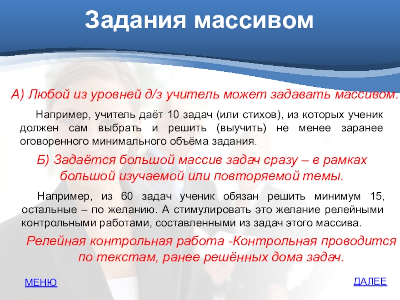 Слайд 165А) Любой из уровней д/з учитель может задавать массивом.