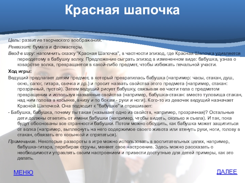 игру: напомнить сказку "Красная Шапочка", в частности эпизод, где Красная Шапочка удивляется переодетому в бабушку волку. Предложение сыграть эпизод в измененном виде: бабушка, узнав о коварстве волка, превращается в какой-либо предмет, чтобы избежать печальной участи.