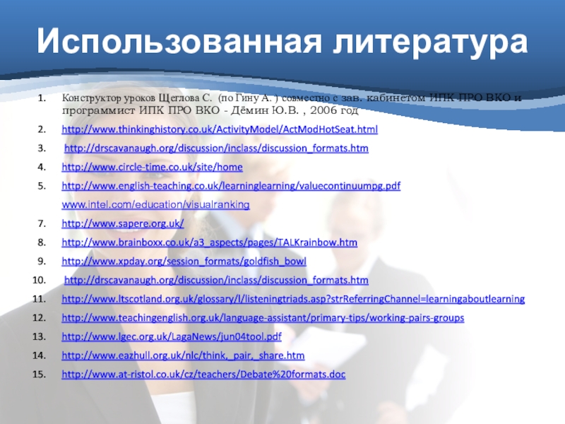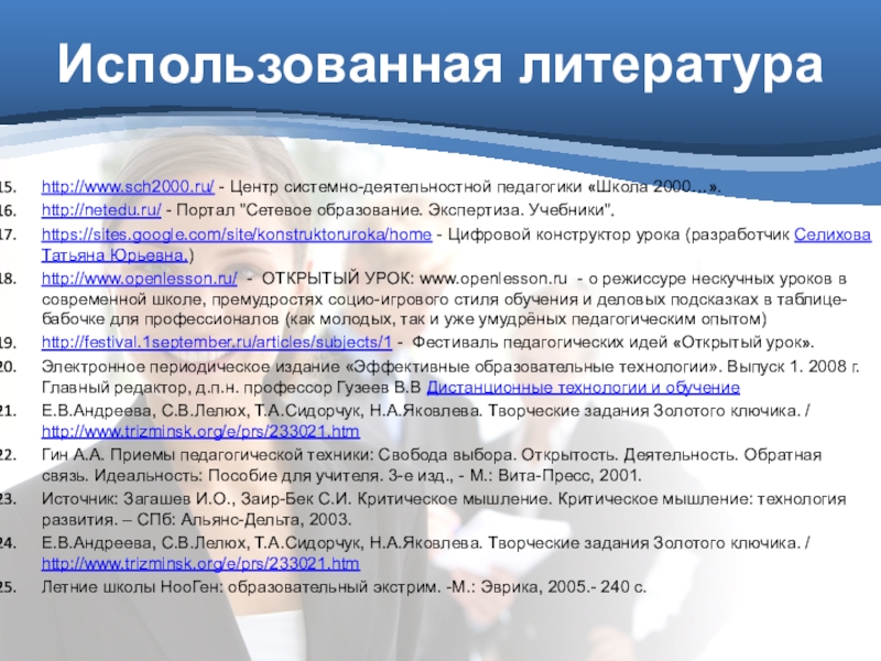 Гин А.А. Приемы педагогической техники: Свобода выбора. Открытость. Деятельность. Обратная связь. Идеальность: Пособие для учителя. 3-е изд., - М.: Вита-Пресс, 2001.