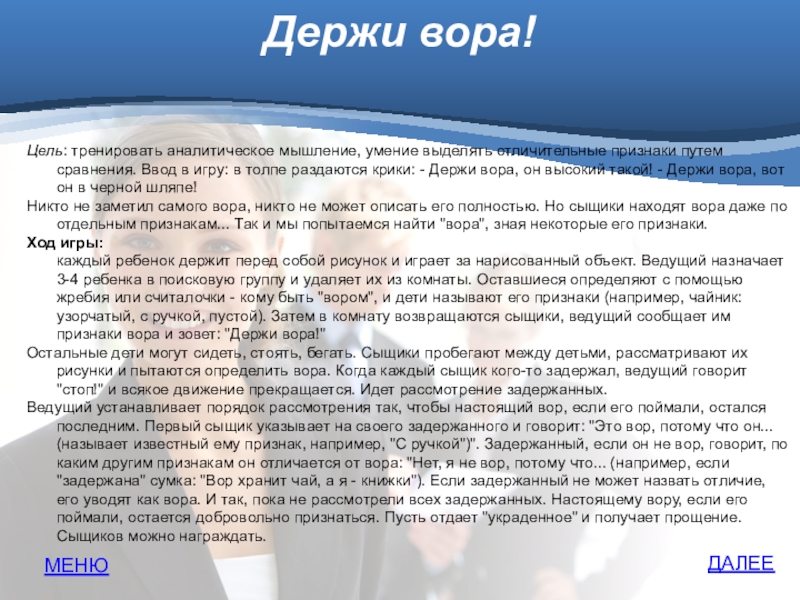 каждый ребенок держит перед собой рисунок и играет за нарисованный объект. Ведущий назначает 3-4 ребенка в поисковую группу и удаляет их из комнаты. Оставшиеся определяют с помощью жребия или считалочки - кому быть "вором", и дети называют его признаки (например, чайник: узорчатый, с ручкой, пустой). Затем в комнату возвращаются сыщики, ведущий сообщает им признаки вора и зовет: "Держи вора!"