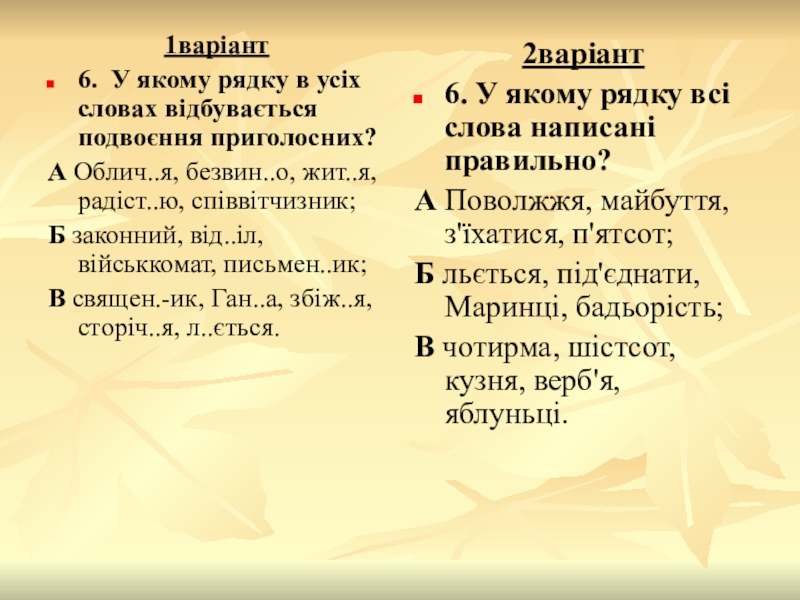 6. У якому рядку всі слова написані правильно?