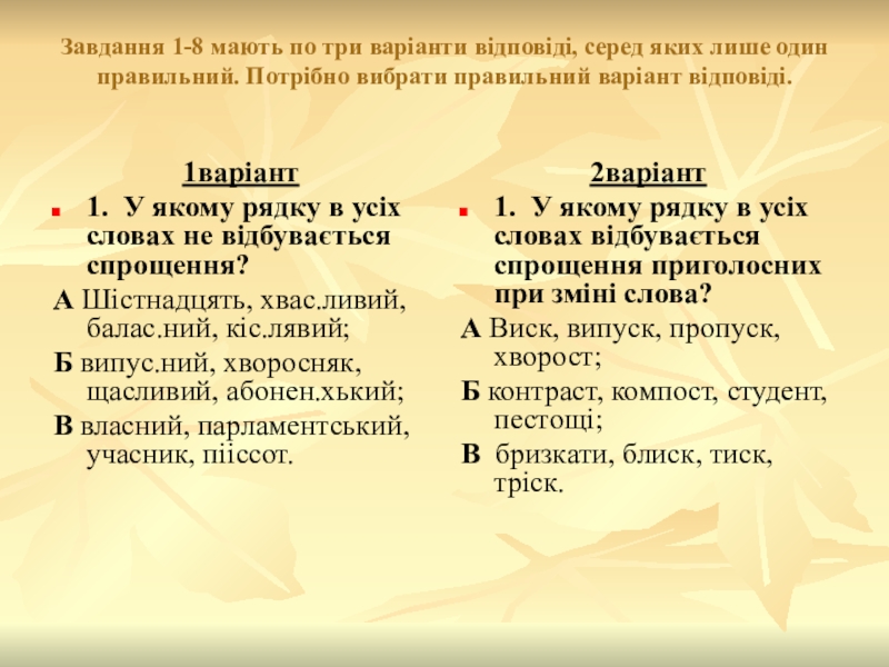 1. У якому рядку в усіх словах не відбувається спрощення?