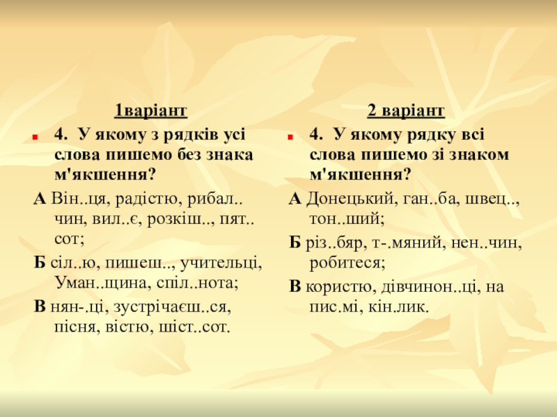 4. У якому рядку всі слова пишемо зі знаком м'якшення?