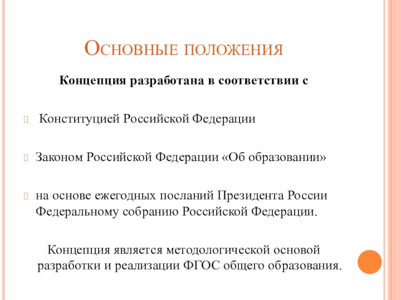 Концепция является методологической основой разработки и реализации ФГОС общего образования.