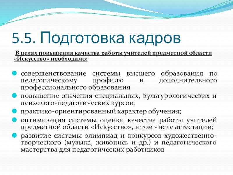 теоретических знаний, базовых принципов, целей, задач и рекомендаций по решению наиболее актуальных проблем, а также основных направлений совершенствования преподавания предметной области «Искусство» в ОО.