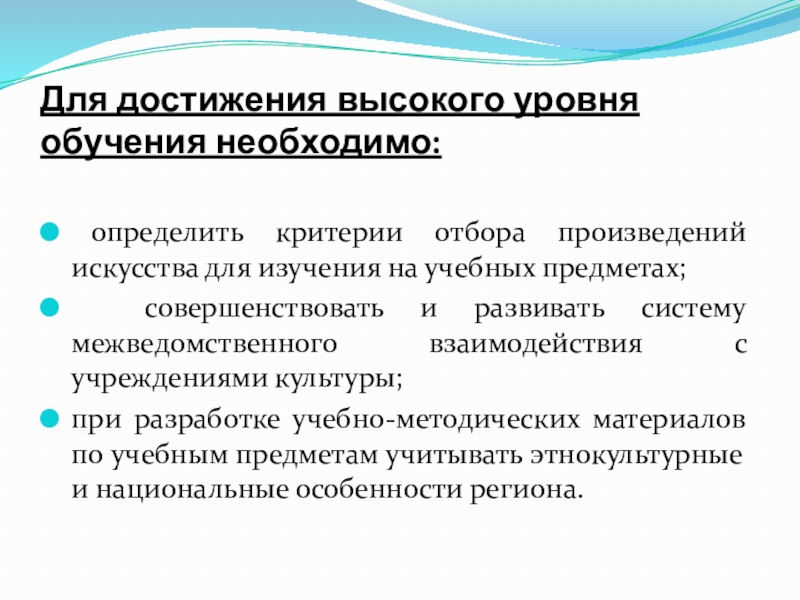 Слайд 13Для достижения высокого уровня обучения необходимо: