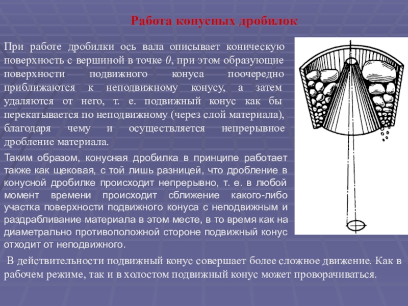 Таким образом, конусная дробилка в принципе работает также как щековая, с той лишь разницей, что дробление в конусной дробилке происходит непрерывно, т. е. в любой момент времени происходит сближение какого-либо участка поверхности подвижного конуса с неподвижным и раздрабливание материала в этом месте, в то время как на диаметрально противоположной стороне подвижный конус отходит от неподвижного.