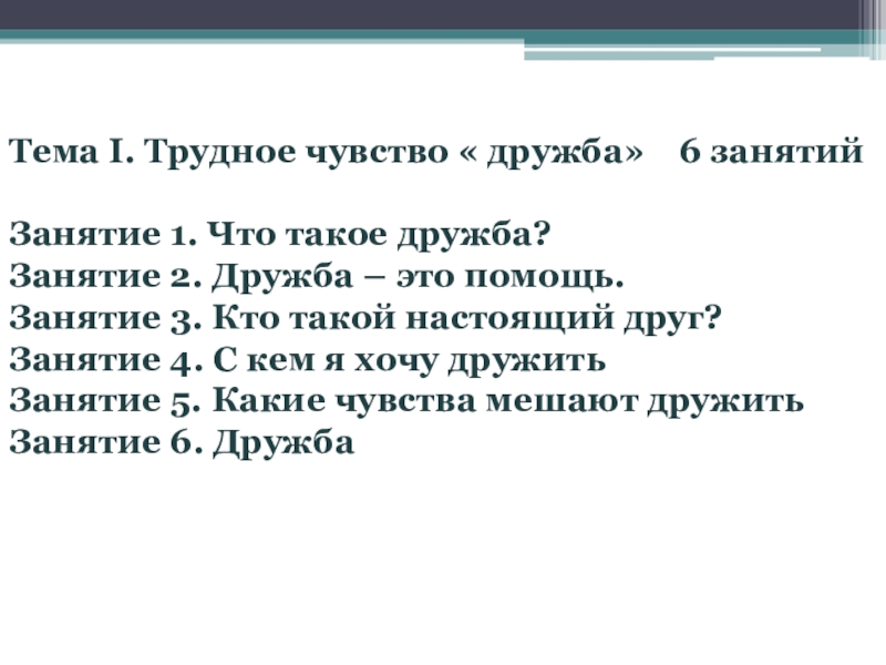 Слайд 11Тема I. Трудное чувство « дружба» 6 занятий