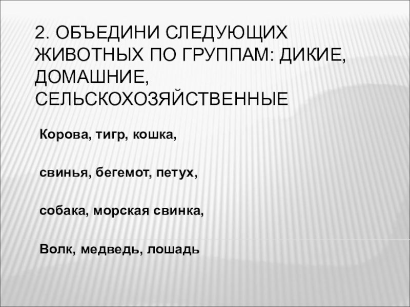 Слайд 42. ОБЪЕДИНИ СЛЕДУЮЩИХ ЖИВОТНЫХ ПО ГРУППАМ: ДИКИЕ, ДОМАШНИЕ, СЕЛЬСКОХОЗЯЙСТВЕННЫЕ