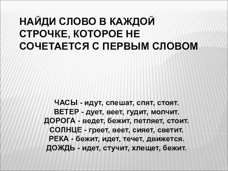 Слайд 3НАЙДИ СЛОВО В КАЖДОЙ СТРОЧКЕ, КОТОРОЕ НЕ СОЧЕТАЕТСЯ С ПЕРВЫМ СЛОВОМ