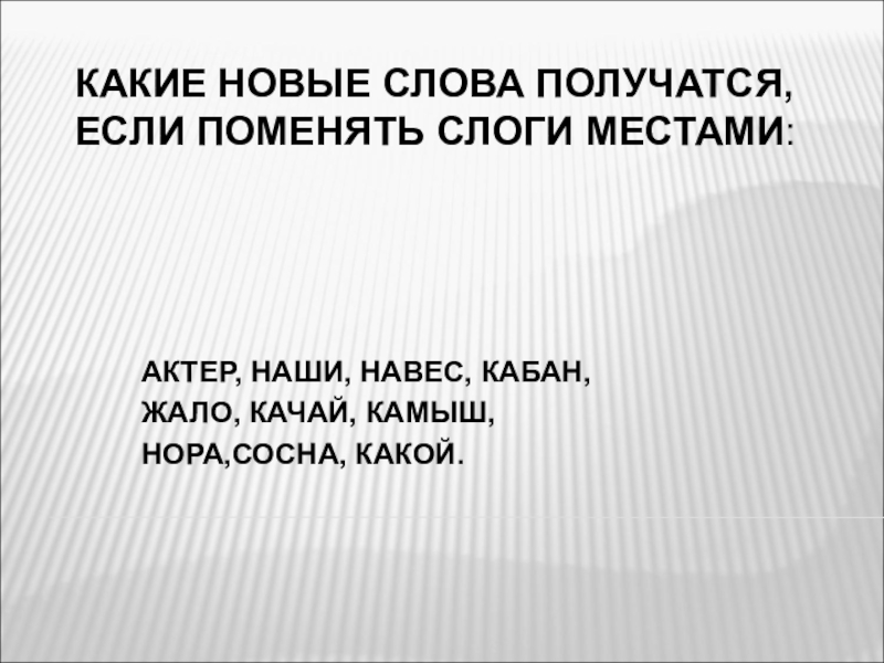 Слайд 10КАКИЕ НОВЫЕ СЛОВА ПОЛУЧАТСЯ, ЕСЛИ ПОМЕНЯТЬ СЛОГИ МЕСТАМИ: