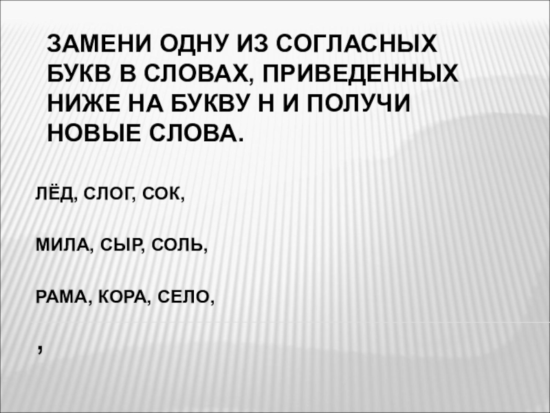 Слайд 7ЗАМЕНИ ОДНУ ИЗ СОГЛАСНЫХ БУКВ В СЛОВАХ, ПРИВЕДЕННЫХ НИЖЕ НА БУКВУ