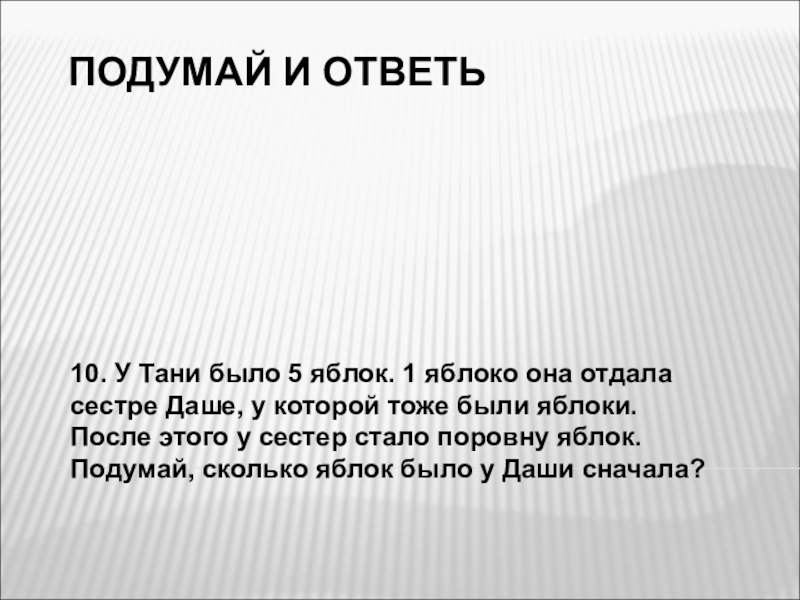 отдала сестре Даше, у которой тоже были яблоки. После этого у сестер стало поровну яблок. Подумай, сколько яблок было у Даши сначала?