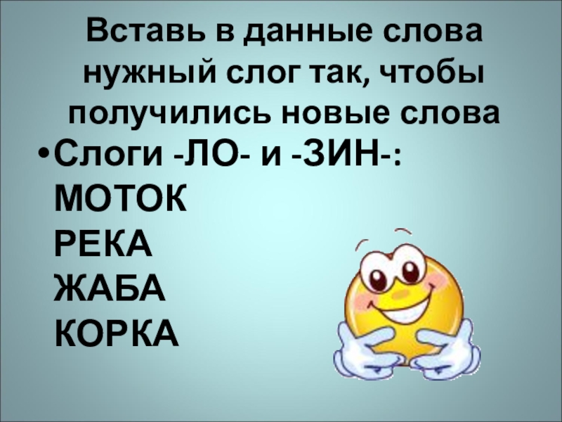 Вставь в данные слова нужный слог так, чтобы получились новые словаСлоги -ЛО- и -ЗИН-: МОТОК РЕКА ЖАБА